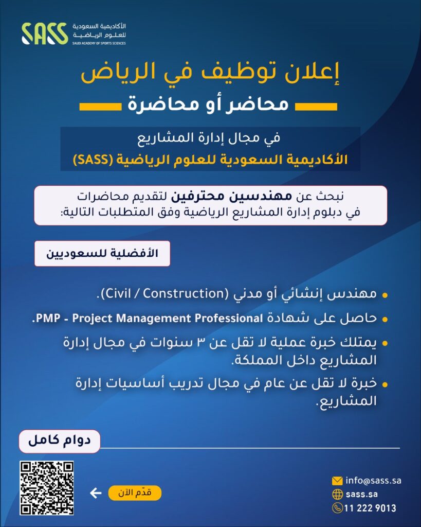 فرصة مميزة للمهندسين المحترفين للانضمام لفريق التدريس في دبلوم إدارة المشاريع الرياضية بالأكاديمية السعودية للعلوم الرياضية (SASS).